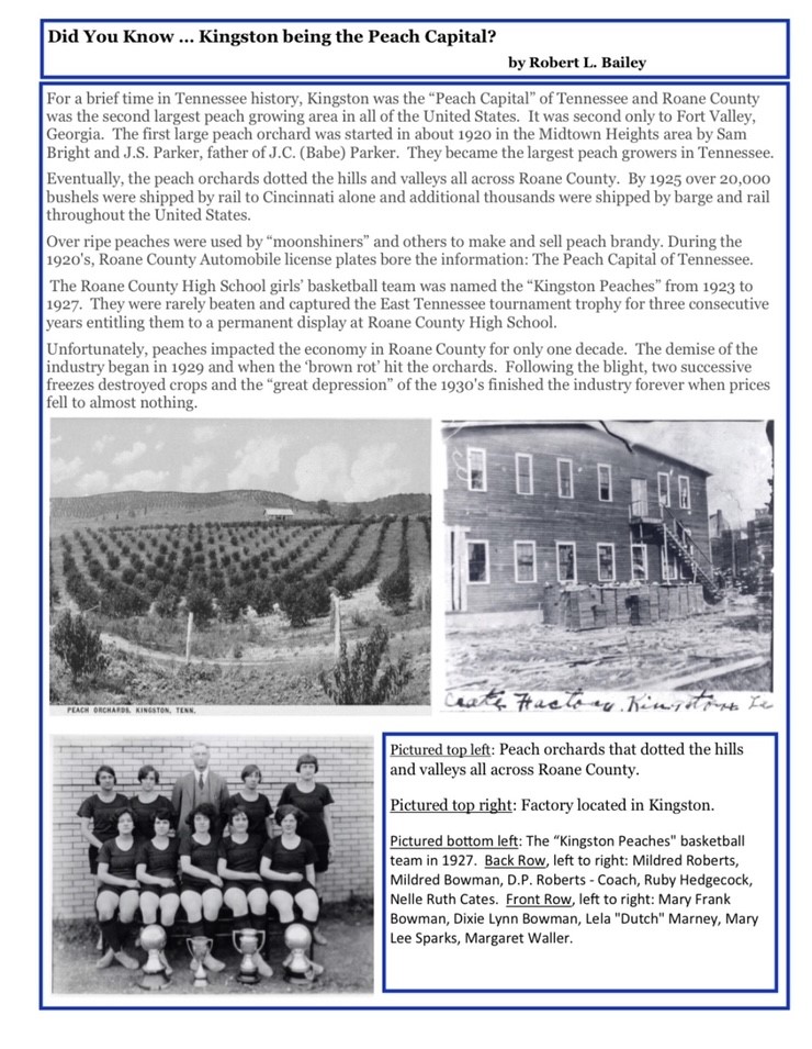 On September 21, 1807, Kingston was Tennessee’s state capital for one day. The Tennessee General Assembly convened in Kingston that day due to an agreement with the Cherokee, who had been told that if the Cherokee Nation ceded the land that is now Roane County, Kingston would become the capital of Tennessee. After adjourning that day, the Assembly resumed meeting in Knoxville.